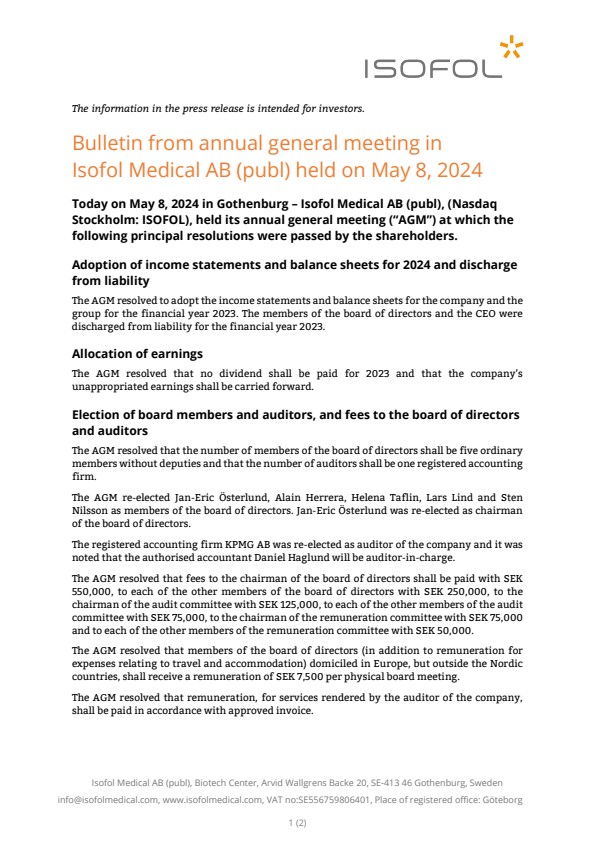 Today on May 8, 2024 in Gothenburg – Isofol Medical AB (publ), (Nasdaq Stockholm: ISOFOL), held its annual general meeting (“AGM”) at which the following principal resolutions were passed by the shareholders.