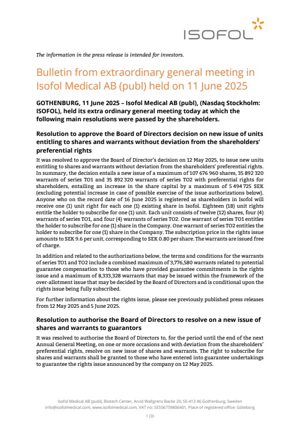 GOTHENBURG, 11 June 2025 – Isofol Medical AB (publ), (Nasdaq Stockholm: ISOFOL), held its extra ordinary general meeting today at which the following main resolutions were passed by the shareholders.
