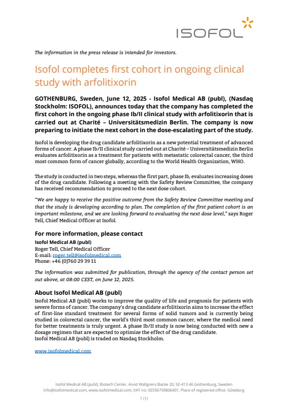 GOTHENBURG, Sweden, June 12, 2025 – Isofol Medical AB (publ), (Nasdaq Stockholm: ISOFOL), announces today that the company has completed the first cohort in the ongoing phase Ib/II clinical study with arfolitixorin that is carried out at Charité – Universitätsmedizin Berlin. The company is now preparing to initiate the next cohort in the dose-escalating part of the study.