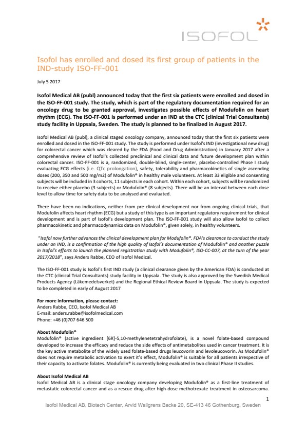 Isofol Medical AB (publ), a clinical staged oncology company, announced today that the first six patients were enrolled and dosed in the ISO-FF-001 study. The study is performed under Isofol’s IND (investigational new drug) for colorectal cancer which was cleared by the FDA (Food and Drug Administration) in January 2017 after a comprehensive review of Isofol’s collected preclinical and clinical data and future development plan within colorectal cancer. ISO-FF-001 is a, randomized, double-blind, single-center, placebo-controlled Phase I study evaluating ECG effects (i.e. QTc prolongation), safety, tolerability and pharmacokinetics of single ascending doses (200, 350 and 500 mg/m2) of Modufolin® in healthy male volunteers. At least 33 eligible and consenting subjects will be included in 3 cohorts, 11 subjects in each cohort. Within each cohort, subjects will be randomized to receive either placebo (3 subjects) or Modufolin® (8 subjects). There will be an interval between each dose level to allow time for safety data to be analysed and evaluated.