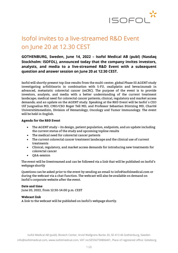 Isofol will shortly present top-line results from the multi-center, global Phase III AGENT study investigating arfolitixorin in combination with 5-FU, oxaliplatin and bevacizumab in advanced, metastatic colorectal cancer (mCRC). The purpose of the event is to provide investors, analysts, and media with a better understanding of the current treatment landscape; medical need for colorectal cancer patients; clinical, regulatory and market access demands; and an update on the AGENT study. Speaking at the R&D Event will be Isofol´s CEO Ulf Jungnelius MD, CMO/CSO Roger Tell MD, and Professor Sebastian Stintzing MD, Charité Universitätsmedizin, Division of Hematology, Oncology and Tumor Immunology. The event will be held in English.