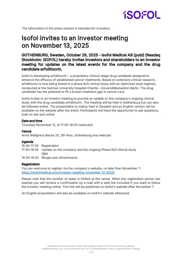 GOTHENBURG, Sweden, October 28, 2025 – Isofol Medical AB (publ) (Nasdaq Stockholm: ISOFOL) hereby invites investors and shareholders to an investor meeting for updates on the latest events for the company and the drug candidate arfolitixorin.