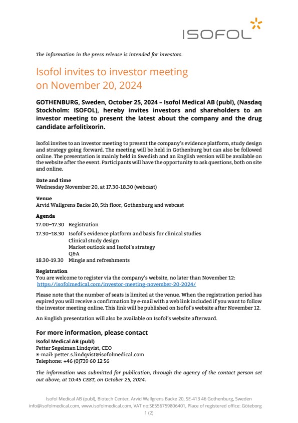 GOTHENBURG, Sweden, October 25, 2024 – Isofol Medical AB (publ), (Nasdaq Stockholm: ISOFOL), hereby invites investors and shareholders to an investor meeting to present the latest about the company and the drug candidate arfolitixorin.