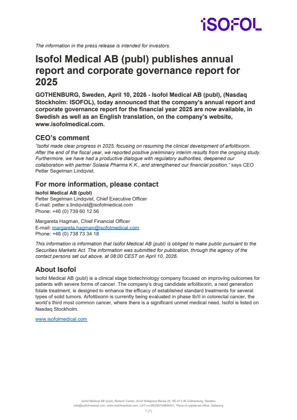 GOTHENBURG, Sweden, April 10, 2026 – Isofol Medical AB (publ), (Nasdaq Stockholm: ISOFOL), today announced that the company’s annual report and corporate governance report for the financial year 2025 are now available, in Swedish as well as an English translation, on the company’s website, www.isofolmedical.com.