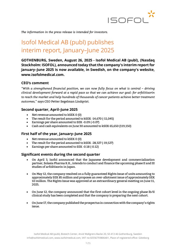 GOTHENBURG, Sweden, August 26, 2025 – Isofol Medical AB (publ), (Nasdaq Stockholm: ISOFOL), announced today that the company’s interim report for January–June 2025 is now available, in Swedish, on the company’s website, www.isofolmedical.com.