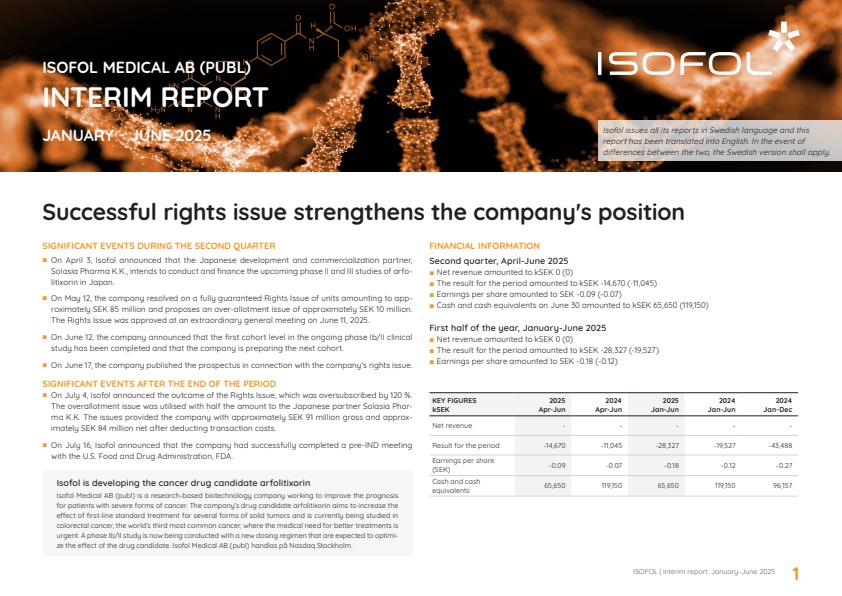 This information is information that Isofol Medical AB (publ) is obliged to make public pursuant to the Securities Markets Act. The information was submitted for publication, through the agency of the contact person set out above, at 08:00 CEST, on August 26, 2025.