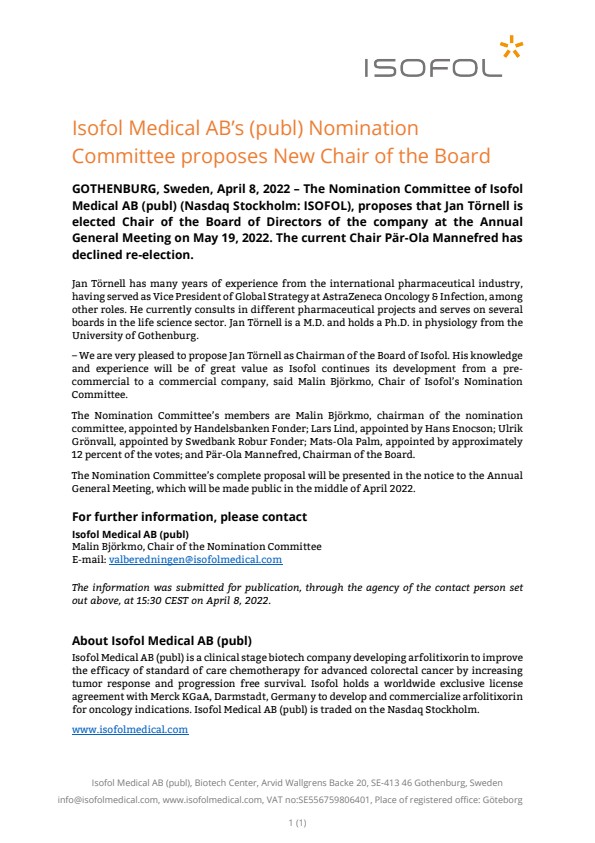 – We are very pleased to propose Jan Törnell as Chairman of the Board of Isofol. His knowledge and experience will be of great value as Isofol continues its development from a pre-commercial to a commercial company, said Malin Björkmo, Chair of Isofol’s Nomination Committee.