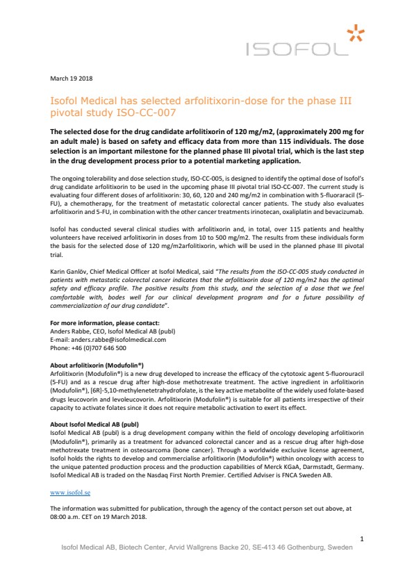 Karin Ganlöv, Chief Medical Officer at Isofol Medical, said “The results from the ISO-CC-005 study conducted in patients with metastatic colorectal cancer indicates that the arfolitixorin dose of 120 mg/m2 has the optimal safety and efficacy profile. The positive results from this study, and the selection of a dose that we feel comfortable with, bodes well for our clinical development program and for a future possibility of commercialization of our drug candidate”.