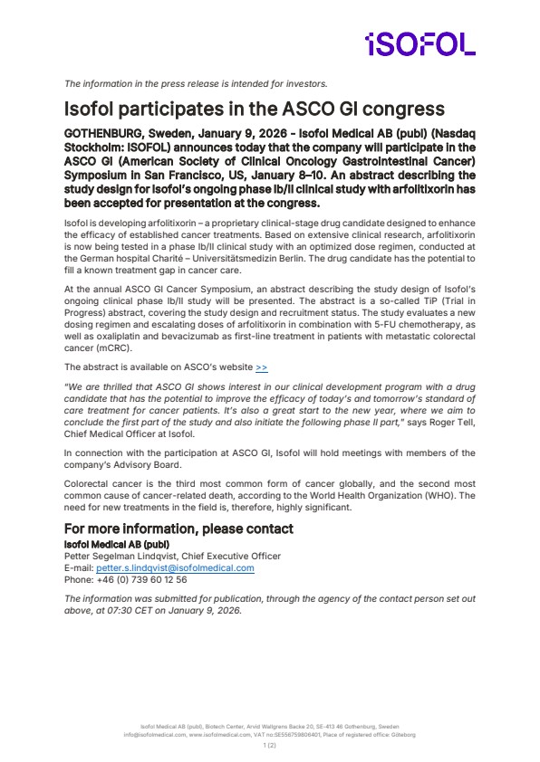 GOTHENBURG, Sweden, January 9, 2026 – Isofol Medical AB (publ) (Nasdaq Stockholm: ISOFOL) announces today that the company will participate in the ASCO GI (American Society of Clinical Oncology Gastrointestinal Cancer) Symposium in San Francisco, US, January 8–10. An abstract describing the study design for Isofol’s ongoing phase Ib/II clinical study with arfolitixorin has been accepted for presentation at the congress.