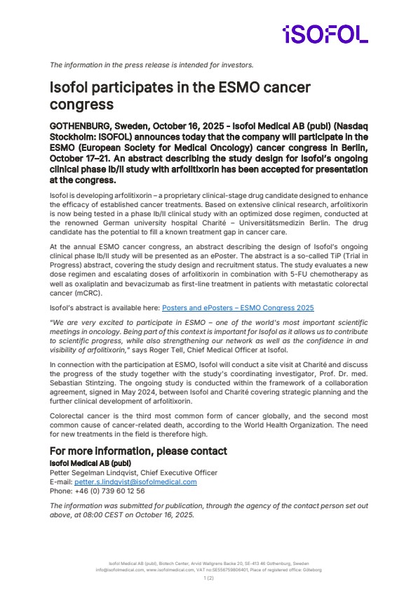 GOTHENBURG, Sweden, October 16, 2025 – Isofol Medical AB (publ) (Nasdaq Stockholm: ISOFOL) announces today that the company will participate in the ESMO (European Society for Medical Oncology) cancer congress in Berlin, October 17–21. An abstract describing the study design for Isofol’s ongoing clinical phase Ib/II study with arfolitixorin has been accepted for presentation at the congress.