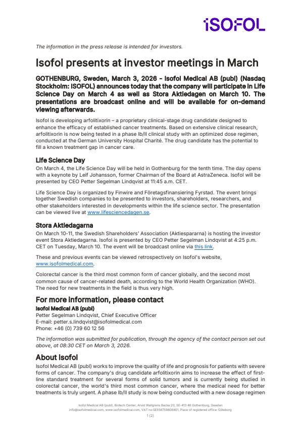 GOTHENBURG, Sweden, March 3, 2026 – Isofol Medical AB (publ) (Nasdaq Stockholm: ISOFOL) announces today that the company will participate in Life Science Day on March 4 as well as Stora Aktiedagen on March 10. The presentations are broadcast online and will be available for on-demand viewing afterwards.