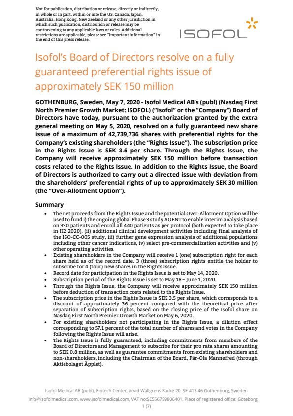 Shareholders receive 1 (one) subscription right for each share held on the record date. 3 (three) subscription rights entitle to subscription of 4 (four) shares in the Rights Issue, at a subscription price of SEK 3.5 per share. The subscription price corresponds to a discount of approximately 36 percent compared to the theoretical price after the separation of subscription rights, based on the closing price of the Isofol share on May 6, 2020 on Nasdaq First North Premier Growth Market. The Rights Issue will provide Isofol with a maximum of SEK 149,589,076, before deduction of transaction costs, by issuing a maximum of 42,739,736 shares.