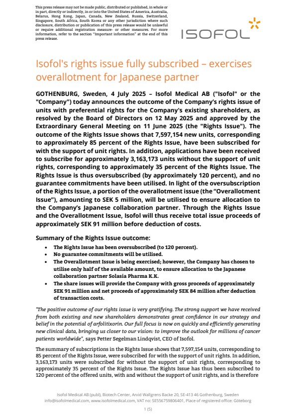GOTHENBURG, Sweden, 4 July 2025 – Isofol Medical AB (“Isofol” or the “Company”) today announces the outcome of the Company’s rights issue of units with preferential rights for the Company’s existing shareholders, as resolved by the Board of Directors on 12 May 2025 and approved by the Extraordinary General Meeting on 11 June 2025 (the “Rights Issue”). The outcome of the Rights Issue shows that 7,597,154 new units, corresponding to approximately 85 percent of the Rights Issue, have been subscribed for with the support of unit rights. In addition, applications have been received to subscribe for approximately 3,163,173 units without the support of unit rights, corresponding to approximately 35 percent of the Rights Issue. The Rights Issue is thus oversubscribed (by approximately 120 percent), and no guarantee commitments have been utilised. In light of the oversubscription of the Rights Issue, a portion of the overallotment issue (the “Overallotment Issue”), amounting to SEK 5 million, will be utilised to ensure allocation to the Company’s Japanese collaboration partner. Through the Rights Issue and the Overallotment Issue, Isofol will thus receive total issue proceeds of approximately SEK 91 million before deduction of costs.