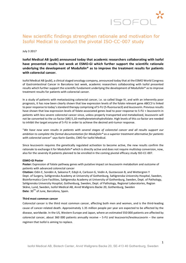 Isofol Medical AB (publ) announced today that academic researchers collaborating with Isofol have presented results last week at ESMO-GI which further support the scientific rationale underlying the development of Modufolin® as to improve the treatment results for patients with colorectal cancer.