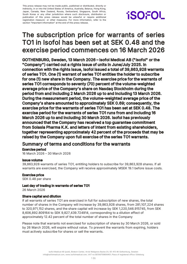 GOTHENBURG, Sweden, 13 March 2026 – Isofol Medical AB (“Isofol” or the “Company”) carried out a rights issue of units in June/July 2025. In connection with the rights issue, Isofol issued a total of 39,863,928 warrants of series TO1. One (1) warrant of series TO1 entitles the holder to subscribe for one (1) new share in the Company. The exercise price for the warrants of series TO1 corresponds to seventy (70) percent of the volume-weighted average price of the Company’s share on Nasdaq Stockholm during the period from and including 2 March 2026 up to and including 13 March 2026. During the measurement period, the volume-weighted average price of the Company’s share amounted to approximately SEK 0.69; consequently, the exercise price for the warrants of series TO1 has been set at SEK 0.48. The exercise period for the warrants of series TO1 runs from and including 16 March 2026 up to and including 30 March 2026. Isofol has previously announced that the Company has received a top guarantee commitment from Solasia Pharma K.K. and letters of intent from existing shareholders, together representing approximately 42 percent of the proceeds that may be raised by the Company upon full exercise of the series TO1 warrants.