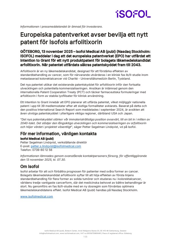 GÖTEBORG, 13 november 2025 – Isofol Medical AB (publ) (Nasdaq Stockholm: ISOFOL) meddelar i dag att det europeiska patentverket (EPO) har utfärdat ett Intention to Grant för ett nytt produktpatent för bolagets läkemedelskandidat arfolitixorin. När patentet utfärdats säkras patentskyddet fram till 2043.