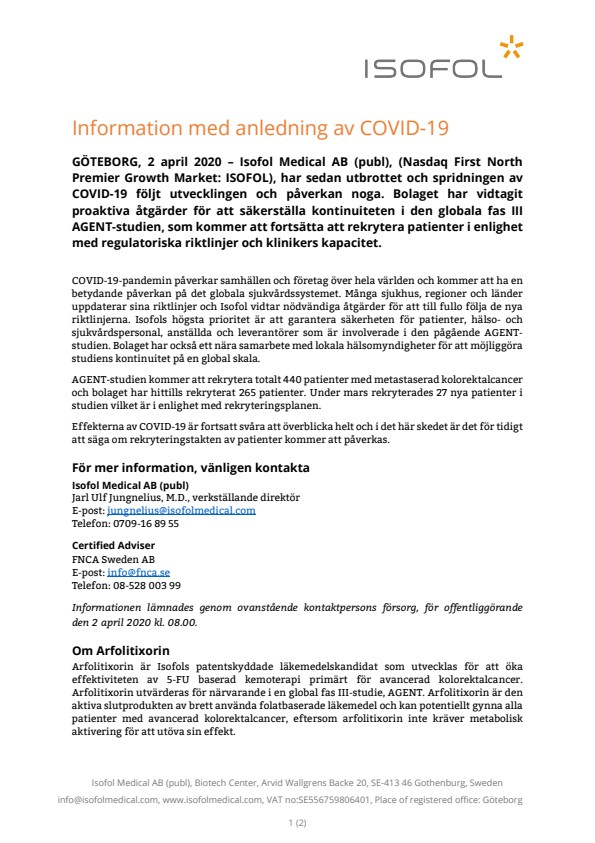 COVID-19-pandemin påverkar samhällen och företag över hela världen och kommer att ha en betydande påverkan på det globala sjukvårdssystemet. Många sjukhus, regioner och länder uppdaterar sina riktlinjer och Isofol vidtar nödvändiga åtgärder för att till fullo följa de nya riktlinjerna. Isofols högsta prioritet är att garantera säkerheten för patienter, hälso- och sjukvårdspersonal, anställda och leverantörer som är involverade i den pågående AGENT-studien. Bolaget har också ett nära samarbete med lokala hälsomyndigheter för att möjliggöra studiens kontinuitet på en global skala.