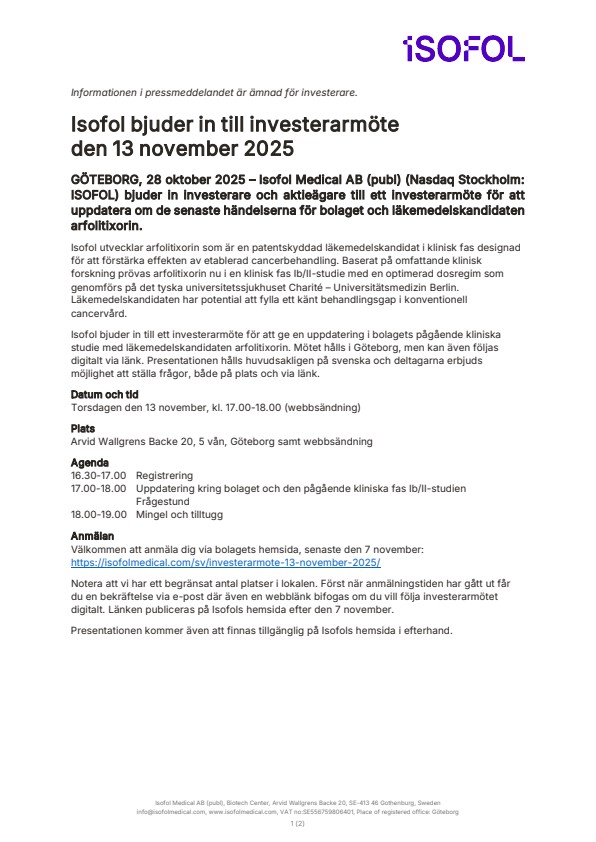 GÖTEBORG, 28 oktober 2025 – Isofol Medical AB (publ) (Nasdaq Stockholm: ISOFOL) bjuder in investerare och aktieägare till ett investerarmöte för att uppdatera om de senaste händelserna för bolaget och läkemedelskandidaten arfolitixorin.