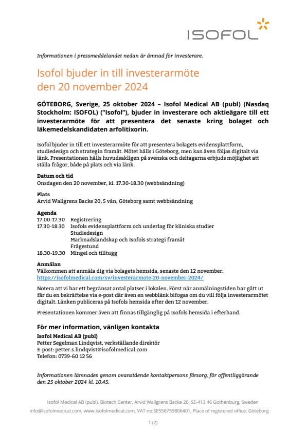 GÖTEBORG, Sverige, 25 oktober 2024 – Isofol Medical AB (publ) (Nasdaq Stockholm: ISOFOL) (”Isofol”), bjuder in investerare och aktieägare till ett investerarmöte för att presentera det senaste kring bolaget och läkemedelskandidaten arfolitixorin.