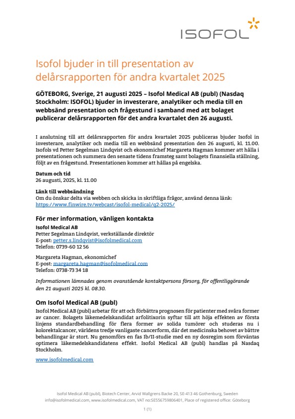 GÖTEBORG, Sverige, 21 augusti 2025 – Isofol Medical AB (publ) (Nasdaq Stockholm: ISOFOL) bjuder in investerare, analytiker och media till en webbsänd presentation och frågestund i samband med att bolaget publicerar delårsrapporten för det andra kvartalet den 26 augusti.