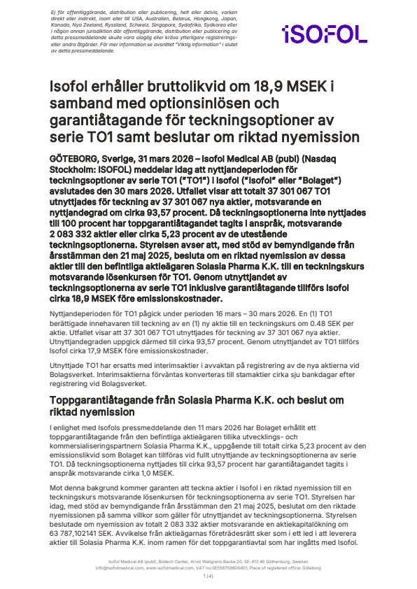 GÖTEBORG, Sverige, 31 mars 2026 – Isofol Medical AB (publ) (Nasdaq Stockholm: ISOFOL) meddelar idag att nyttjandeperioden för teckningsoptioner av serie TO1 (”TO1”) i Isofol (”Isofol” eller ”Bolaget”) avslutades den 30 mars 2026. Utfallet visar att totalt 37 301 067 TO1 utnyttjades för teckning av 37 301 067 nya aktier, motsvarande en nyttjandegrad om cirka 93,57 procent. Då teckningsoptionerna inte nyttjades till 100 procent har toppgarantiåtagandet tagits i anspråk, motsvarande 2 083 332 aktier eller cirka 5,23 procent av de utestående teckningsoptionerna. Styrelsen avser att, med stöd av bemyndigande från årsstämman den 21 maj 2025, besluta om en riktad nyemission av dessa aktier till den befintliga aktieägaren Solasia Pharma K.K. till en teckningskurs motsvarande lösenkursen för TO1. Genom utnyttjandet av teckningsoptionerna av serie TO1 inklusive garantiåtagande tillförs Isofol cirka 18,9 MSEK före emissionskostnader.