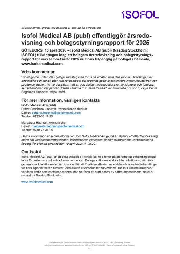 GÖTEBORG, 10 april 2026 – Isofol Medical AB (publ) (Nasdaq Stockholm: ISOFOL) tillkännagav idag att bolagets årsredovisning och bolagsstyrningsrapport för verksamhetsåret 2025 nu finns tillgänglig på bolagets hemsida, www.isofolmedical.com.