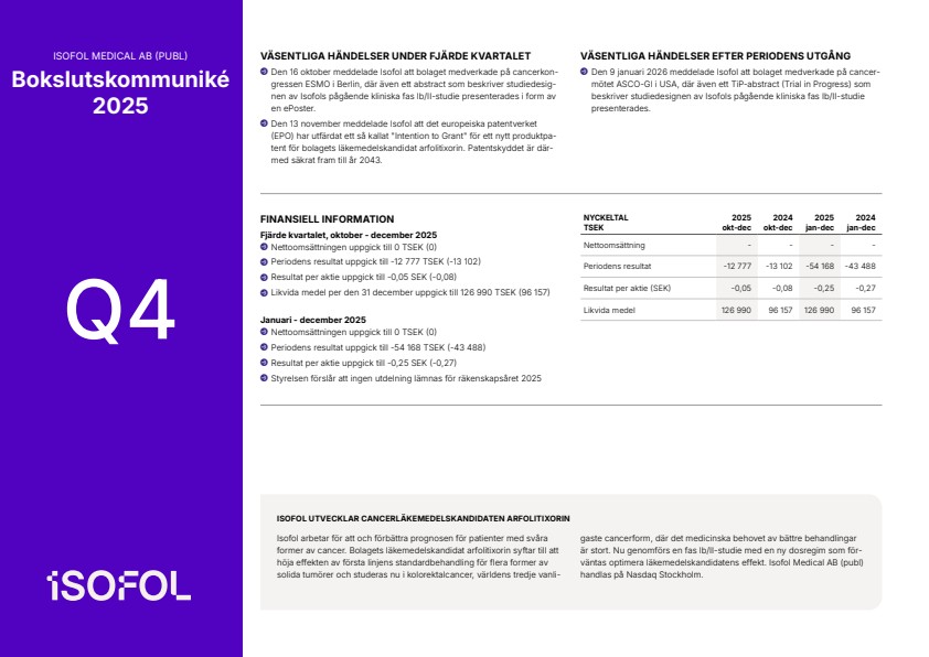 - Den 9 januari 2026 meddelade Isofol att bolaget medverkade på cancermötet ASCO-GI i USA, där även ett TiP-abstract (Trial in Progress) som beskriver studiedesignen av Isofols pågående kliniska fas Ib/II-studie presenterades.