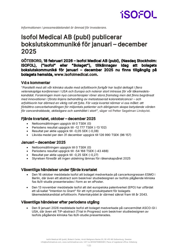GÖTEBORG, 18 februari 2026 – Isofol Medical AB (publ), (Nasdaq Stockholm: ISOFOL), (”Isofol” eller ”Bolaget”), tillkännagav idag att bolagets bokslutskommuniké för januari – december 2025 nu finns tillgänglig på bolagets hemsida, www.isofolmedical.com.