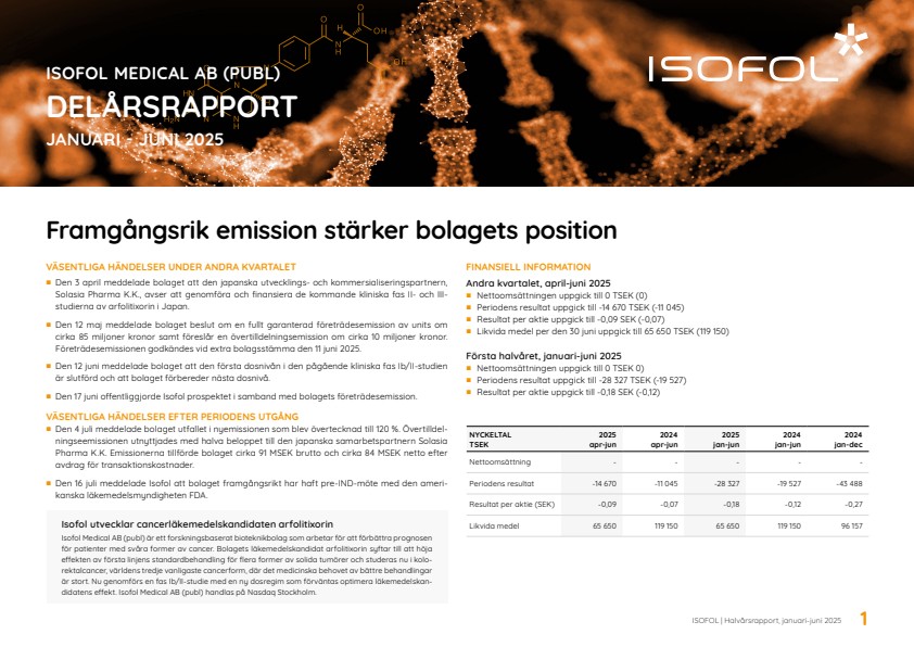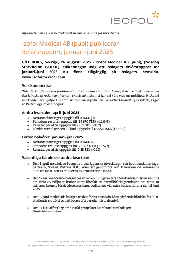 GÖTEBORG, Sverige, 26 augusti 2025 – Isofol Medical AB (publ), (Nasdaq Stockholm: ISOFOL), tillkännagav idag att bolagets delårsrapport för januari–juni 2025 nu finns tillgänglig på bolagets hemsida, www.isofolmedical.com.