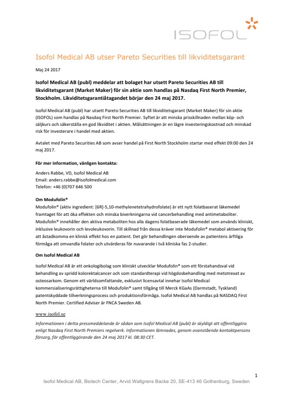 Isofol Medical AB (publ) har utsett Pareto Securities AB till likviditetsgarant (Market Maker) för sin aktie (ISOFOL) som handlas på Nasdaq First North Premier. Syftet är att minska prisskillnaden mellan köp- och säljkurs och säkerställa en god likviditet i aktien. Målsättningen är en lägre investeringskostnad och minskad risk för investerare i handel med aktien.