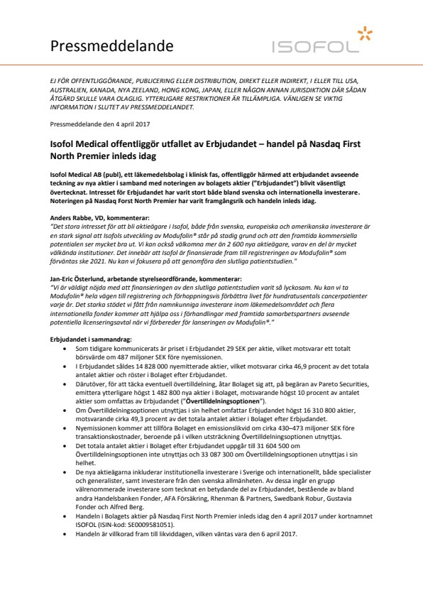Isofol Medical AB (publ), ett läkemedelsbolag i klinisk fas, offentliggör härmed att erbjudandet avseende teckning av nya aktier i samband med noteringen av bolagets aktier (”Erbjudandet”) blivit väsentligt övertecknat. Intresset för Erbjudandet har varit stort både bland svenska och internationella investerare. Noteringen på Nasdaq Forst North Premier har varit framgångsrik och handeln inleds idag.