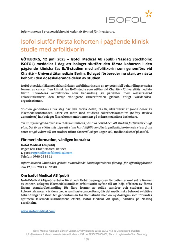 GÖTEBORG, 12 juni 2025 – Isofol Medical AB (publ) (Nasdaq Stockholm: ISOFOL) meddelar i dag att bolaget slutfört den första kohorten i den pågående kliniska fas Ib/II-studien med arfolitixorin som genomförs vid Charité – Universitätsmedizin Berlin. Bolaget förbereder nu start av nästa kohort i den doseskalerande delen av studien.