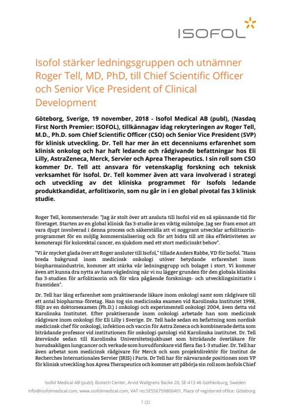 Roger Tell, kommenterade: ”Jag är stolt över att ansluta till Isofol vid en så spännande tid för företaget. Starten av en global klinisk fas 3-studie är en viktig milstolpe. Jag ser fram emot att vara djupt involverad i denna process och säkerställa att vi noggrant utvecklar arfolitixorin-programmet för en möjlig kommersialisering och för att bidra till att öka effektiviteten av kemoterapi för kolorektal cancer, en sjukdom med ett stort medicinskt behov”.