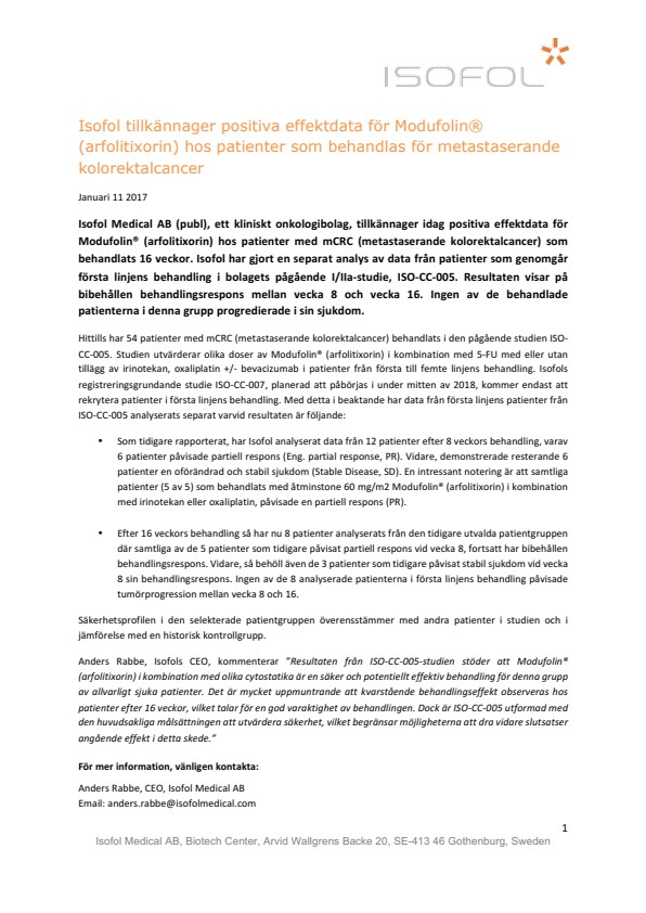 Anders Rabbe, Isofols CEO, kommenterar ”Resultaten från ISO-CC-005-studien stöder att Modufolin® (arfolitixorin) i kombination med olika cytostatika är en säker och potentiellt effektiv behandling för denna grupp av allvarligt sjuka patienter. Det är mycket uppmuntrande att kvarstående behandlingseffekt observeras hos patienter efter 16 veckor, vilket talar för en god varaktighet av behandlingen. Dock är ISO-CC-005 utformad med den huvudsakliga målsättningen att utvärdera säkerhet, vilket begränsar möjligheterna att dra vidare slutsatser angående effekt i detta skede.”