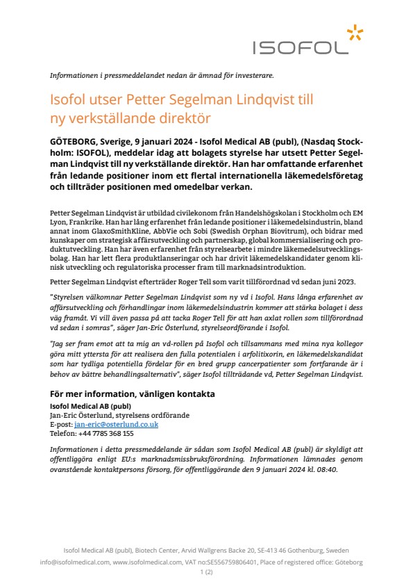 ”Styrelsen välkomnar Petter Segelman Lindqvist som ny vd i Isofol. Hans långa erfarenhet av affärsutveckling och förhandlingar inom läkemedelsindustrin kommer att stärka bolaget i dess väg framåt. Vi vill även passa på att tacka Roger Tell för att han axlat rollen som tillförordnad vd sedan i somras”, säger Jan-Eric Österlund, styrelseordförande i Isofol.
