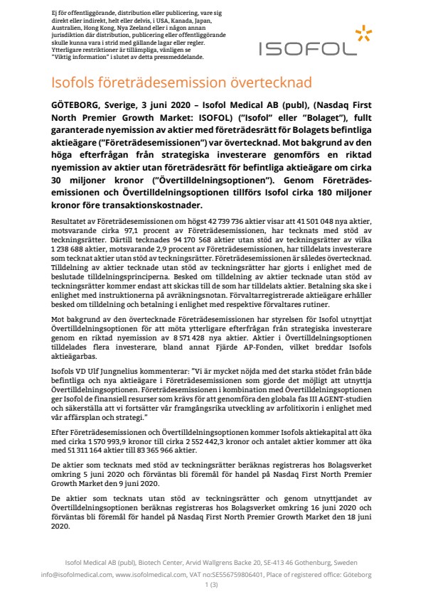 Denna information är sådan information som Isofol Medical AB (publ) är skyldig att offentliggöra enligt EU:s marknadsmissbruksförordning (EU) nr 596/2014. Informationen lämnades för offentliggörande genom Bolagets VD:s försorg den 3 juni 2020 kl. 08.00.