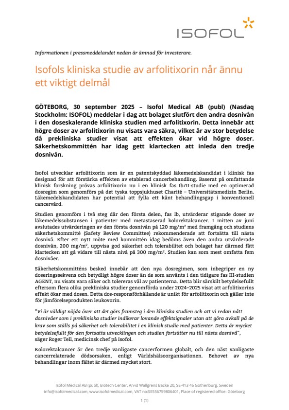 GÖTEBORG, 30 september 2025 – Isofol Medical AB (publ) (Nasdaq Stockholm: ISOFOL) meddelar i dag att bolaget slutfört den andra dosnivån i den doseskalerande kliniska studien med arfolitixorin. Detta innebär att högre doser av arfolitixorin nu visats vara säkra, vilket är av stor betydelse då prekliniska studier visat att effekten ökar vid högre doser. Säkerhetskommittén har idag gett klartecken att inleda den tredje dosnivån.