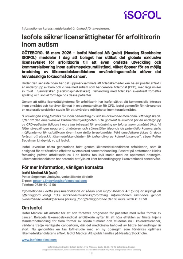 GÖTEBORG, 18 mars 2026 – Isofol Medical AB (publ) (Nasdaq Stockholm: ISOFOL) meddelar i dag att bolaget har utökat det globala exklusiva licensavtalet för arfolitixorin till att även omfatta utveckling och kommersialisering inom autismspektrumtillstånd, vilket öppnar för en möjlig breddning av läkemedelskandidatens användningsområde utöver det huvudsakliga fokusområdet cancer.