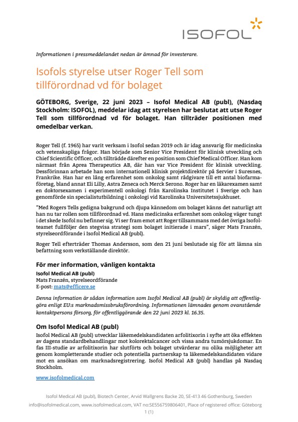 ”Med Rogers Tells gedigna bakgrund och djupa kännedom om bolaget känns det naturligt att han nu tar rollen som tillförordnad vd. Hans medicinska erfarenhet som onkolog väger tungt i det skede Isofol nu befinner sig. Vi ser fram emot att Roger tillsammans med det övriga Isofol-teamet fullföljer den stegvisa strategi som bolaget initierade i mars”, säger Mats Franzén, styrelseordförande i Isofol Medical AB (publ).