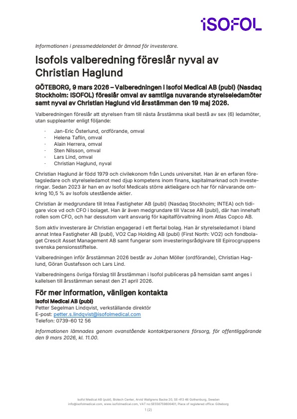 GÖTEBORG, 9 mars 2026 – Valberedningen i Isofol Medical AB (publ) (Nasdaq Stockholm: ISOFOL) föreslår omval av samtliga nuvarande styrelseledamöter samt nyval av Christian Haglund vid årsstämman den 19 maj 2026.