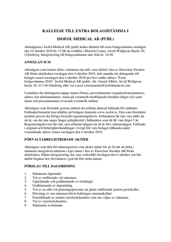 Aktieägare som önskar delta i stämman ska dels vara införd i den av Euroclear Sweden AB förda aktieboken torsdagen den 4 oktober 2018, dels anmäla sitt deltagande till bolaget senast torsdagen den 4 oktober 2018 per brev under adress ”Extra bolagsstämma 2018”, Isofol Medical AB (publ), Att. Gustaf Albèrt, Arvid Wallgrens backe 20, 413 46 Göteborg eller via e-post extrastamma@isofolmedical.com.