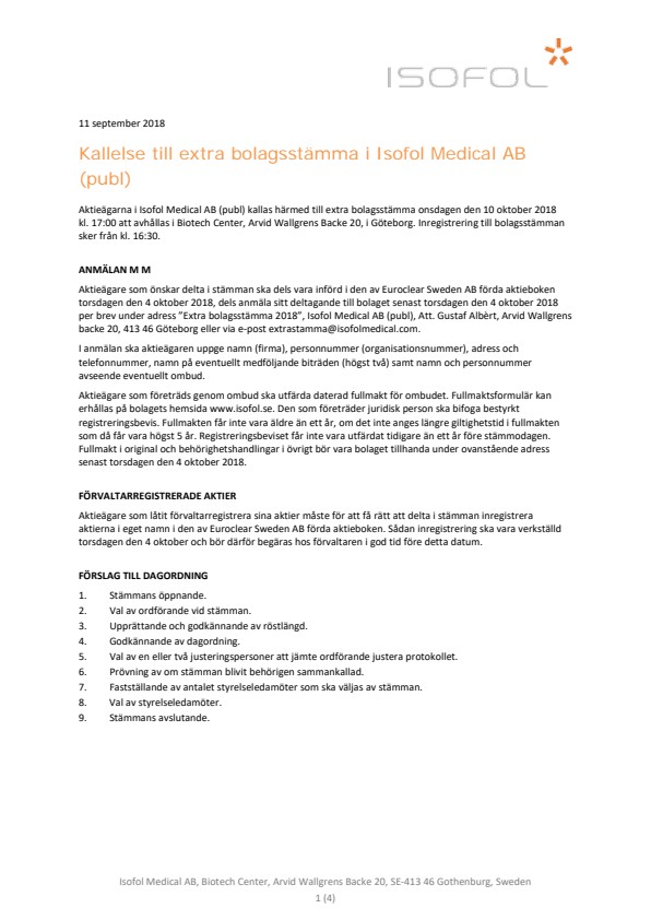 Aktieägare som företräds genom ombud ska utfärda daterad fullmakt för ombudet. Fullmaktsformulär kan erhållas på bolagets hemsida www.isofol.se. Den som företräder juridisk person ska bifoga bestyrkt registreringsbevis. Fullmakten får inte vara äldre än ett år, om det inte anges längre giltighetstid i fullmakten som då får vara högst 5 år. Registreringsbeviset får inte vara utfärdat tidigare än ett år före stämmodagen. Fullmakt i original och behörighetshandlingar i övrigt bör vara bolaget tillhanda under ovanstående adress senast torsdagen den 4 oktober 2018.