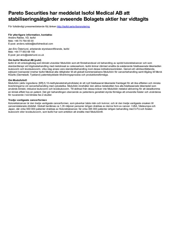 Pareto Securities har meddelat Isofol Medical AB att stabiliseringsåtgärder avseende Bolagets aktier har vidtagits